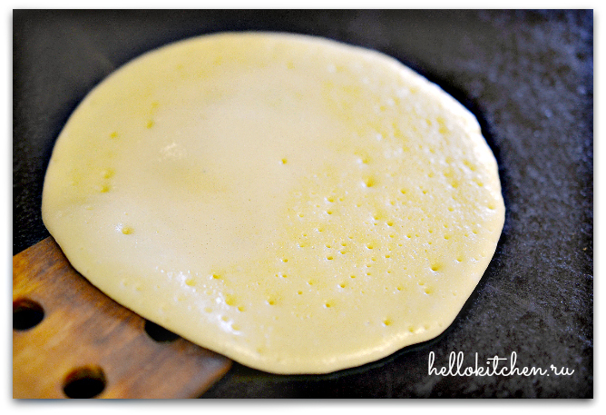 5. Ждём, пока на поверхности блинчика появятся пузырьки и осторожно переворачиваем лопаткой. Жарим ещё несколько секунд.