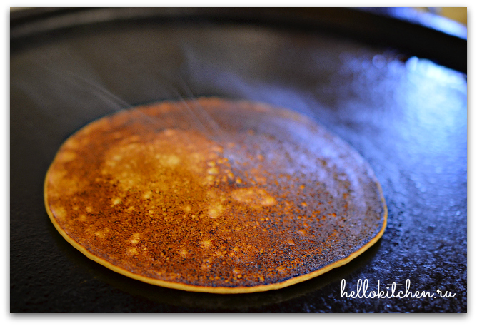 4. Хорошо разогреваем сковороду. Убавляем огонь до среднего. Сбрызгиваем растительным маслом. На середину сковороды выливаем тесто, сковороду при этом не трогаем, тесто само распределиться красивым кружком. Тесто лучше всего отмерять 60 мл чашечкой.