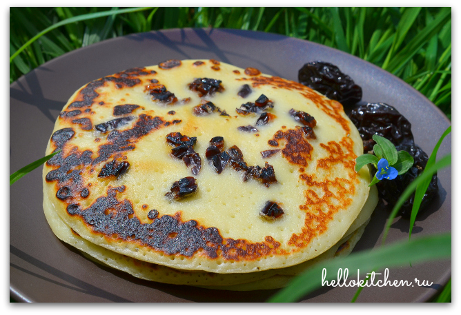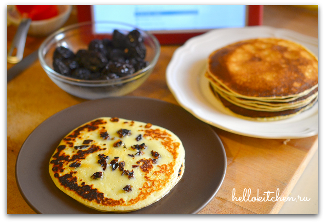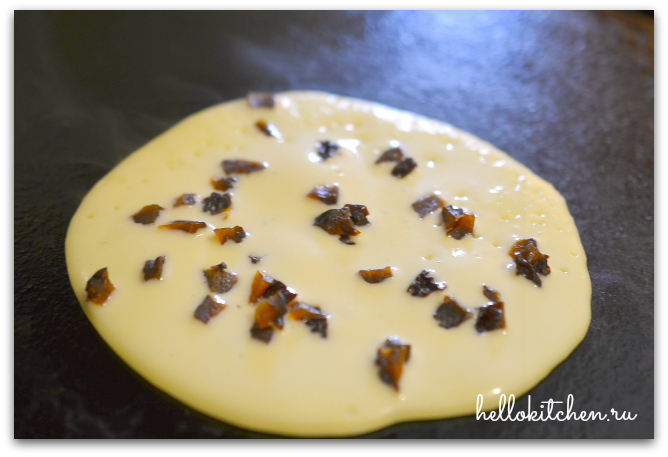 7. Если у вас есть чернослив или другие сухофрукты, можно мелко нарезать их и посыпать блинчик, как только залили тесто на сковороду.