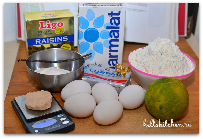 Этот рецепт из книги «On Cooking«, стр. 1139. Я практически ничего не меняла в рецепте, разве что заменила воду на молоко, а лимонную цедру на апельсиновую; из сухофруктов у меня был только изюм, но в оригинале рецепта есть сушеные ананасы и кедровые орешки. Но вы можете добавлять в него всё что любите, например, курагу, инжир, апельсиновые цукаты, чернослив, любые орешки. Кедровые орехи нежные и сладкие, на мой взгляд, подойдут больше всего. Сверху можно присыпать сахарной пудрой или полить сахарной глазурью, как вам больше нравится. Очень важный момент: яйца обязательно должны быть комнатной температуры, а дрожжи свежие (и сухие и не сухие).