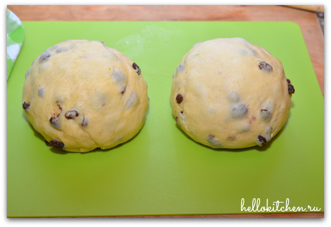 15. Перекладывам тесто на рабочую поверхность, присыпанную мукой. Делим на две равные части. Формируем гладкие шарики, накрываем полотенцем и даем отдохнуть им 5 минут.
