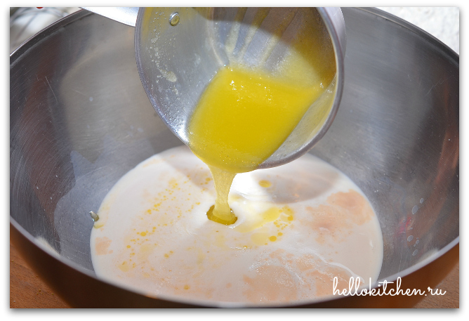6. Добавляем в воду (или молоко) с дрожжами, которые уже слегна набухли, растопленное масло с сахаром. Хорошо вымешиваем.