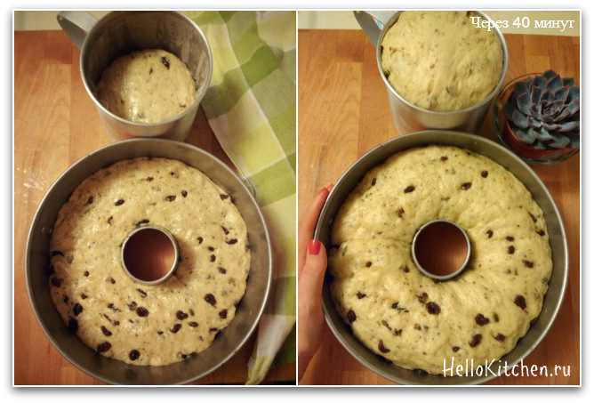 Фото «до и после», здесь хорошо видно, как за 40 минут поднимается тесто в форме. Из указанного количества теста получается один большой круглый калач (икеевская форма) и литровая форма (обычная кружка).