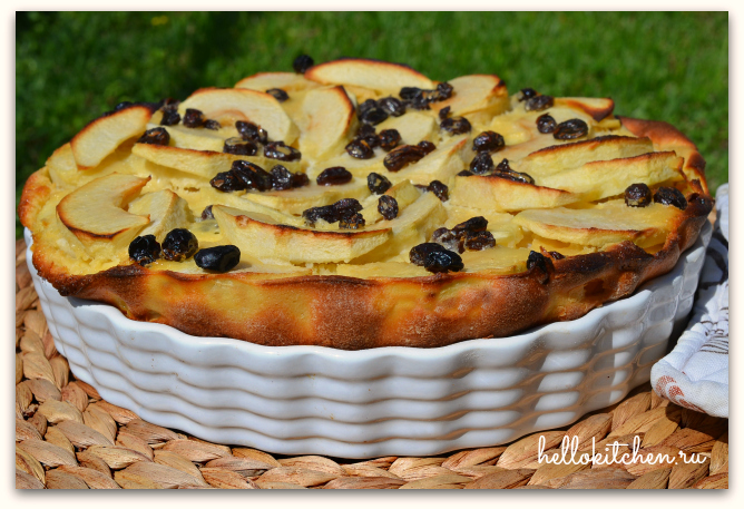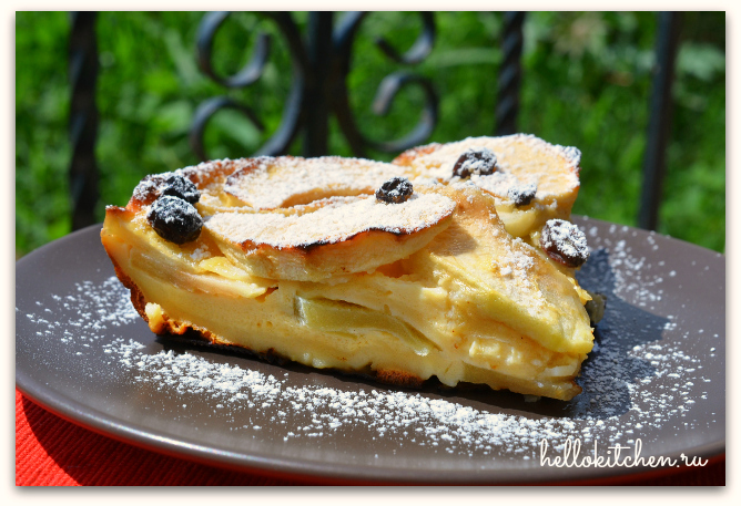7. Всё! Флонярд или клафути готов. Даём ему немного остыть, чтобы пирог осел и структура теста уплотнилась. Перед подачей можно посыпать сахарной пудрой. Мне очень понравился такой ленивый яблочный пирог, можно печь хоть каждый день! Особенно хорошо, что тесто можно приготовить с вечера, а утром, поставив пирог в духовку, поваляться в кровати лишних 40 минут, наслаждаясь вкусным ароматом яблочной выпечки. Тесто после выпечки становится довольно нежное, лёгкой омлетной консистенции, напоминает заварной крем, да ещё и с яблоками. Однозначно, это будет один из любимых рецептов. Ведь так приятно, когда дома с самого утра уютно пахнет яблочной выпечкой, а к завтраку поспевает ароматный яблочный пирог.