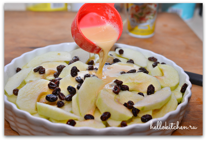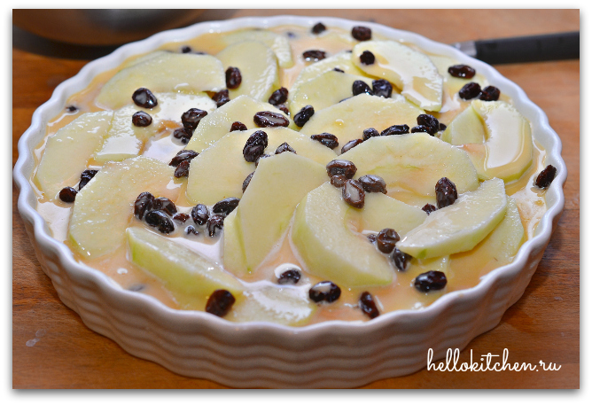 5. В смазанную маслом и посыпанную мукой форму (23см) выкладываем смешанные с изюмом яблоки. Оставшийся ром от изюма выливаем в тесто. Смешиваем и заливаем яблоки тестом.
