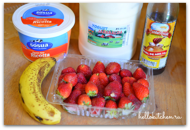 Это даже не рецепт, а идея, так как начинка для такого десерта может быть очень разнообразной. Например, вместе с клубникой (или любыми другими ягодами или фруктами), можно положить горсть кукурузных хлопьев, или нарезанные кубиками зефир или бизе, или и то и другое вместе; также, можно добавить гранолу, овсяные хлопья, а заправить всё не мёдом, а джемом или любимым вареньем, или шоколадным соусом, или сгущёнкой. Я полностью уверена, что такой завтрак очень понравится не только взрослым, но и детям. Вместо рикотты можно брать любой творог, предварительно протерев его через сито, чтобы не было комочков. Йогурт тоже можно брать любой жирности, на ваше усмотрение.