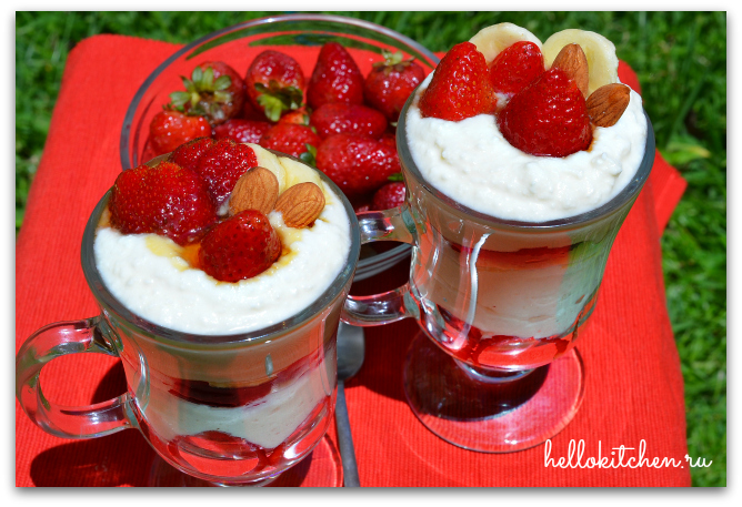 2. Всё! Выкладываем ягоды на дно (у меня клубника и банан), туда же можно насыпать ложку кукурузных хлопьев. Сверху слой творожной массы, потом снова слой ягод и последний слой творожной массы. Украшаем на своё усмотрение. Можно на каждый слой с ягодами капнуть немного мёда, так будет вкуснее и слаще.