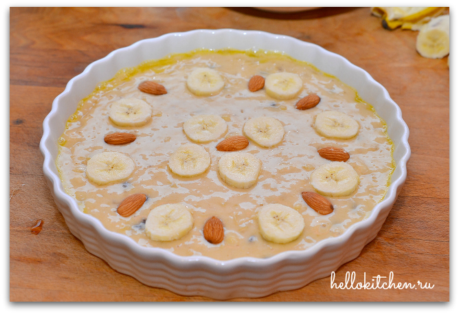 7. Сбрызгиваем растительным маслом форму для выпечки (23 см), но можно выпекть и в форме для кекса или в маленьких формочках для маффин. Выливаем тесто в форму. Украшаем орешками и кружочками бананов (по желанию). Отправляем в разогретую духовку на 35-40 минут.