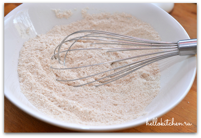 1. Просеиваем все сухие ингредиенты в миску: овсяную муку, разрыхлитель, сахар, соль.
