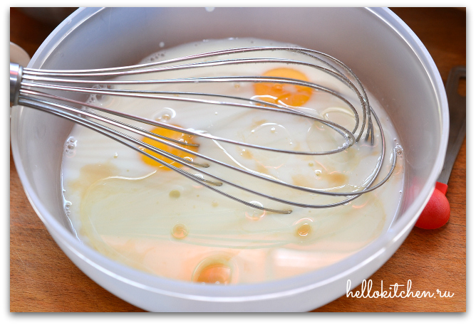 2. В другой миске соединяем все жидкие ингредиенты: молоко, яйца, растительное масло и ванильная эссенция (если у вас ванилин или ванильных сахар, смешайте его с сухими ингредиентыми). Слегка взбиваем венчиком.