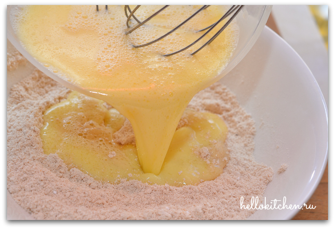 3. Вливаем жидкие ингредиенты в сухие.