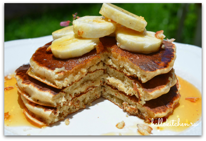 7. Вот и всё! Блинчики получились очень пышные и лёгкие, а главное — полезные! Я подавала их с колечками бананов и миндальными орешками, полив мёдом. Бананы, орехи и мёд идеально сочетаются по вкусу, но можно подавать и с клубничным соусом или со свежими ягодами и мёдом или кленовым сиропом.