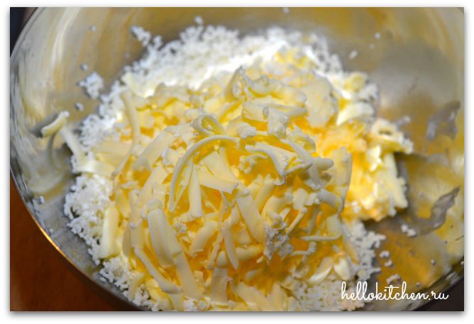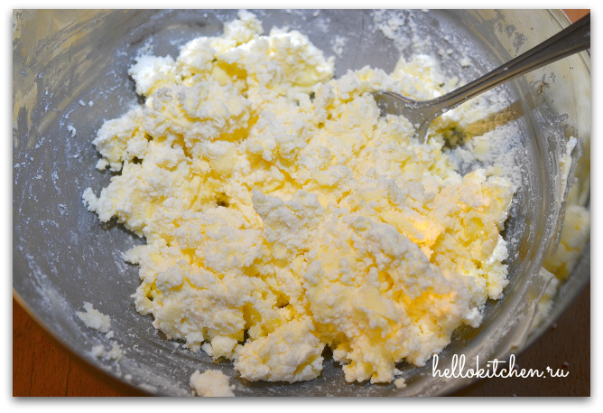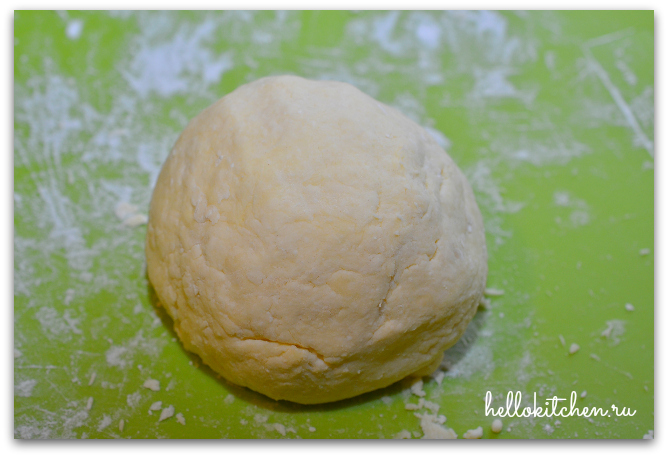 4. Добавляем муку и соль, перемешиваем и выкладываем тесто на рабочую поверхность. Быстро скатываем его в шар. Тесто может взять немного больше муки, зависит от влажности творога. Но не переусердствуйте, иначе печенье получится твёрдое.