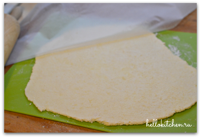 5. Раскатывааем тесто толщиной около 3-5 мм. Чтобы тесто не липло к скалке или столу, лучше всего раскатывать его между двумя листами пекарской бумаги. Так и скалка и стол остаются чистые, и не нужно добавлять много муки.