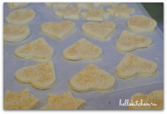6. Вырезаем печенье любимыми формочками. Выкладываем на противень с пекарской бумагой. Каждое печенье слегка посыпаем сахаром, я использую коричневый для более карамельного вкуса. Отправляем в разогретую духовку на 200 градусов на 25-30 минут, пока печенье не подрумянится.