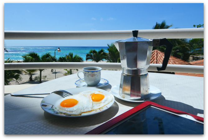 15. Что может быть прекраснее такого утра? Только такое утро и идеальный завтрак! Вы хорошо знаете, что натюрморты моё любимое хобби, вот и тут не удержалась. Что мне нравится в апарт-отелях, это то что тут есть кухня и вся посуда, даже кофеварка, гейзерная. Можно варить себе свой любимый кофе и поджарить яичницу именно так, как любишь! Знаю я, как доминиканские повара жарят яйца. Лучше чем сам, всё равно никто не приготовит.