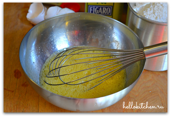 1. Делаем тесто. Слегка взбиваем яйца, оливковое масло, воду и соль.