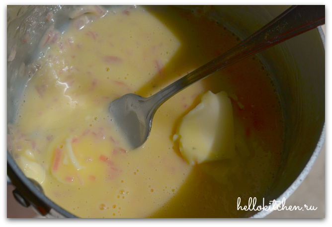 10. Добавляем сливочное масло по маленькому кусочку в кастрюлю с луком. Взбиваем.