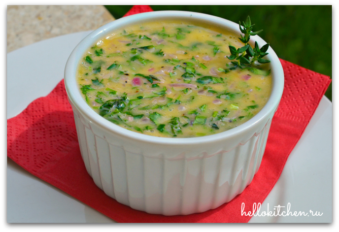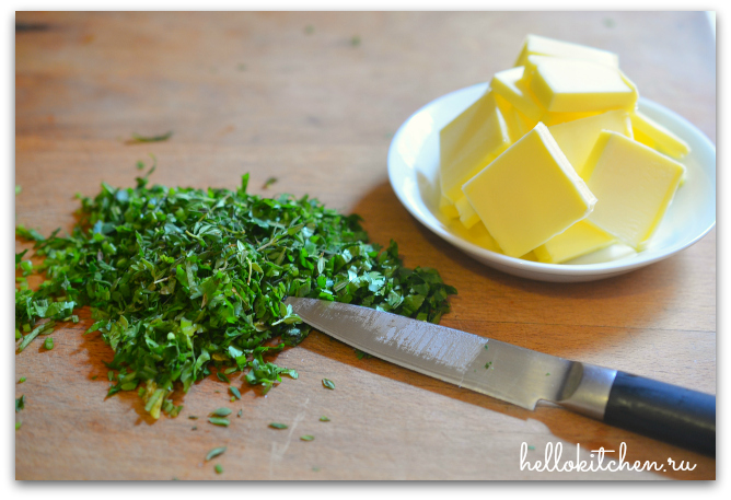 9. Мелко нарезаем зелень и сливочное масло. У меня не оказалось петрушки и базилика, поэтому я использовала только кинзу и тимьян, получилось довольно ароматно.