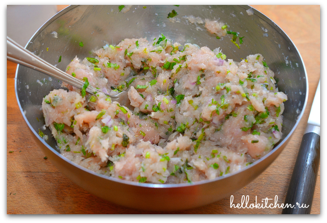 12. Подготавливаем начинку: смешиваем фарш, мелко нарезанный лук, зелень, яйцо. Солим и перчим по вкусу.