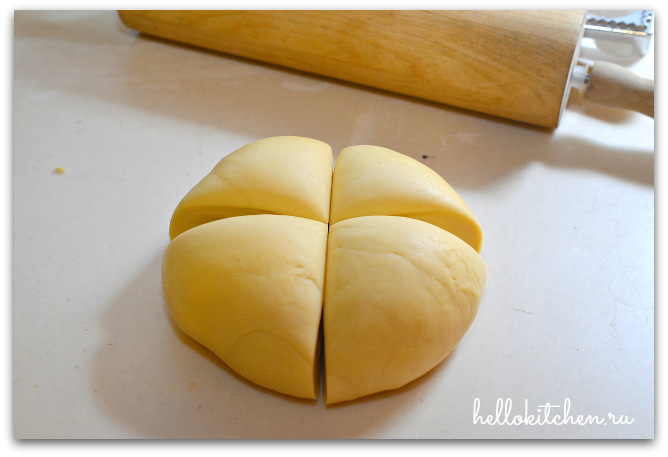 13. Ставим большую кастрюлю с водой на огонь. Делим тесто на 4 части.