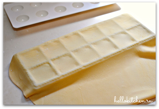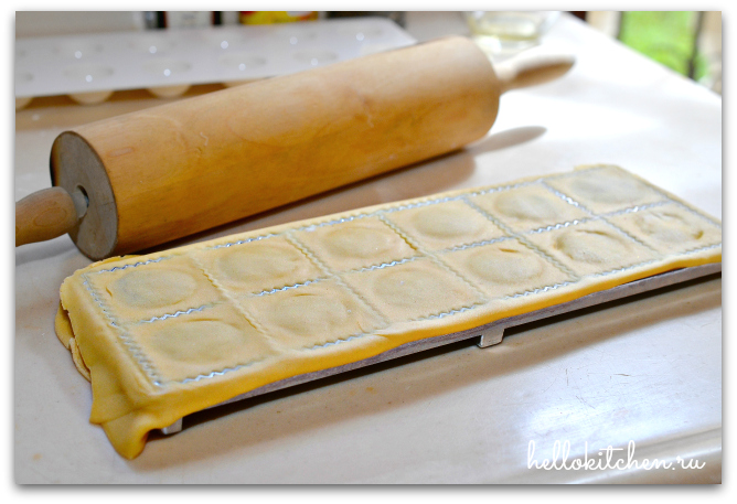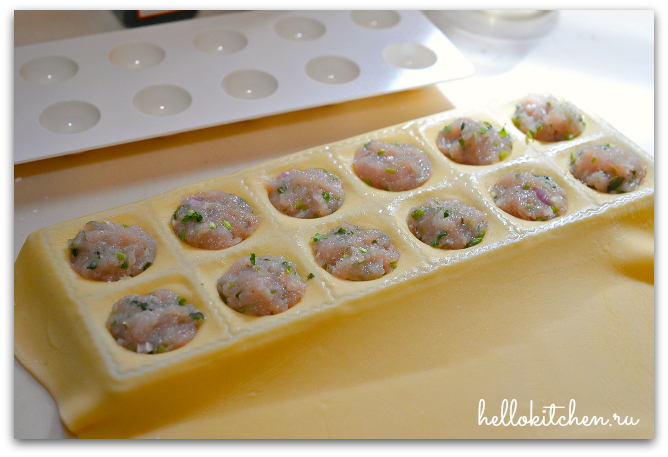 15. Накрываем половиной раскатанного тесто форму для равиоли, предварительно присыпанную мукой (также, можно вырезать тесто стаканом и сделать тортеллини или использовать традиционную пельменницу).