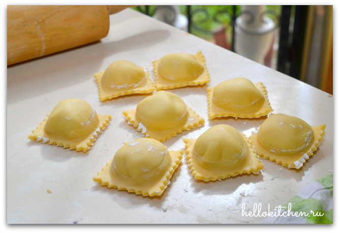 19. Вынимаем получившиеся равиоли из формы, выкладываем на присыпанную мукой поверхность и накрываем их полотенцем, чтобы не подсыхали.