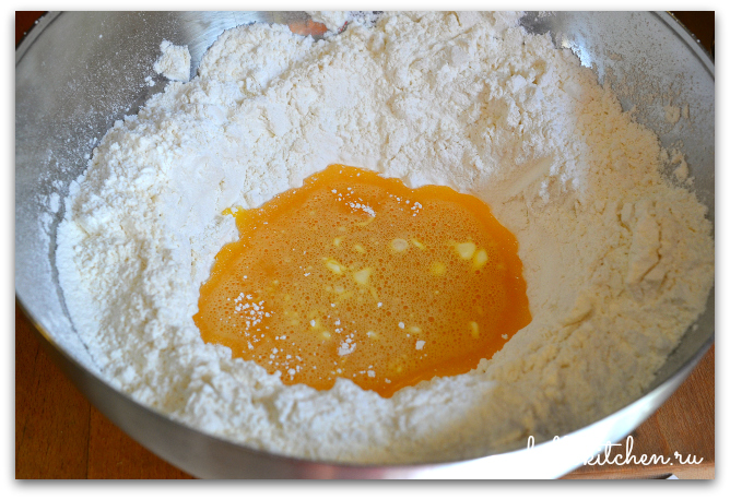 2. Просеиваем муку в большую миску. Делаем широкое углубление и выливаем туда яичную смесь.