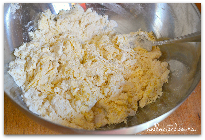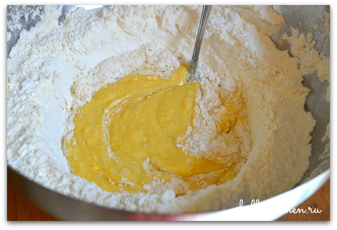 4. Смешиваем до тех пор, пока мука полностью не впитает яичную смесь.