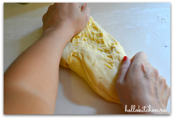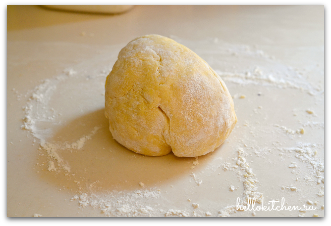 5. Выкладываем тесто на присыпанную мукой рабочую поверхность и начинаем выкатывать тесто.