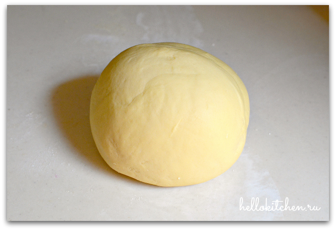 7. Готовое тесто скатываем в шар, накрываем пищевой плёнкой и даём ему постоять 1 час в комнатной температуре.
