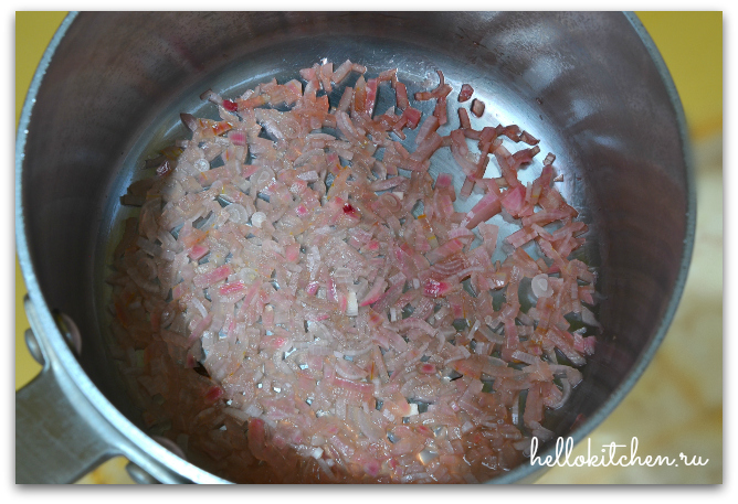 8. А пока займёмся соусом. Смешиваем лук, вино и укусус в небольшой кастрюльке с толстым дном. Ставим на самый маленький огонь и кипятим до тех пор, пока вся жидкость практически не выпарится.