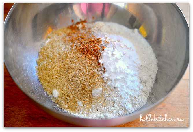 1. Сначала смешиваем сухие ингредиенты: овсяную муку, сахар, соль, разрыхлитель и корицу.