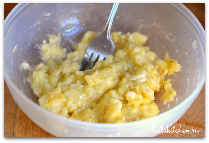 3. Разминаем бананы большой вилкой не до полного пюре, пусть останутся крупные кусочки.