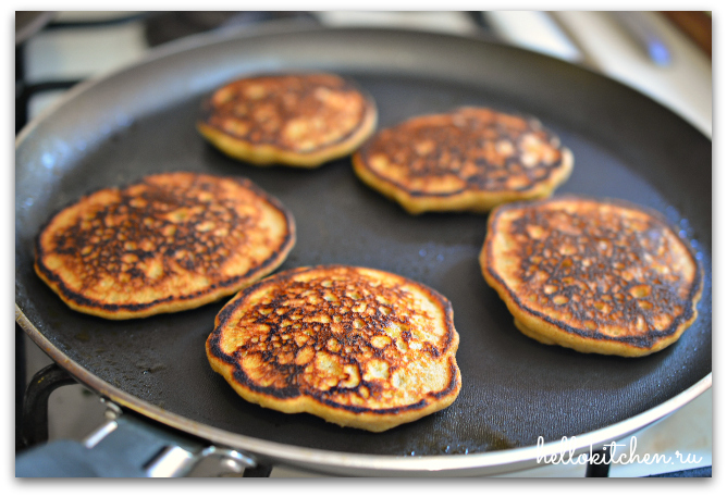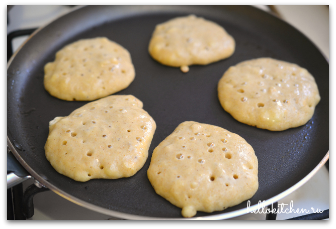 6. Нагреваем сковороду на среднем огне, сбрызгиваем растительным маслом (я использую масляный спрей). Выкладываем тесто на разогретую сковородку столовой ложкой. Накрываем крышкой. Ждём, пока на поверхности не появятся пузырьки. Следим, чтобы оладья не подгорели, если надо, убавьте огонь еще немного.