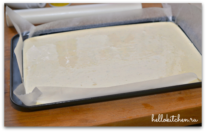 4. Застилаем противень пекарской бумагой и выливаем творожную смесь. Убираем в разогретую духовку примерно на 45 минут, до тех пор, пока масса немного подрумянится и станет упругая посередине.