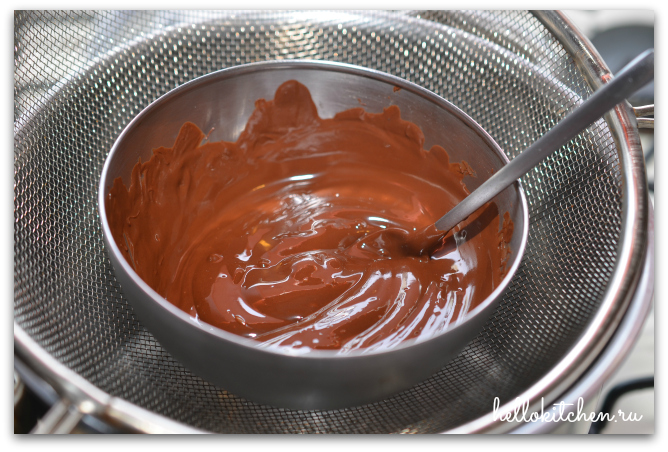 5. А пока займёмся ганашем. На водяной бане растапливаем шоколад (я ставлю железное сито на кастрюльку с кипящей водой, важно, чтобы вода не касалась ёмкости с шоколадом, если шоколад перегреть, он свернётся комками и обратно реанимироваь его уже будет нельзя).