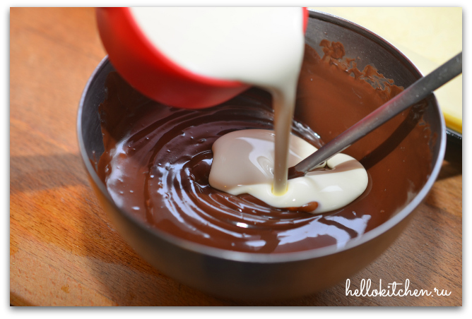 6. Наливаем сливки в растопленный шоколад и хорошо перемешиваем. В этом моменте можно добавить щепотку острого красного перчика, но это на такого любителя, как я.
