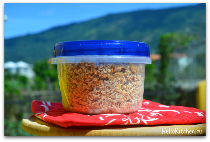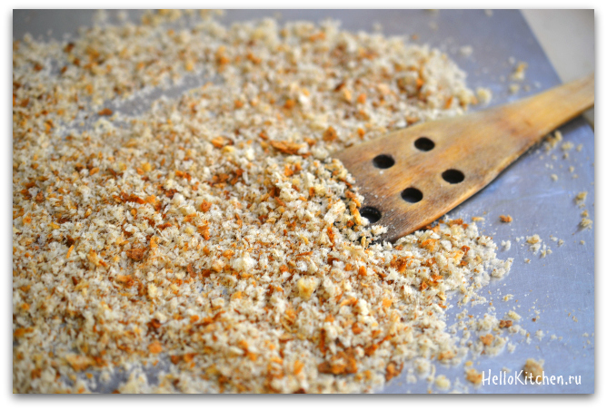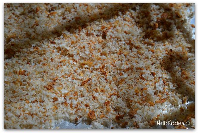 3. Перемешиваем крошки каждые 2 минуты. Нам нужно, чтобы крошки не зажаривались, а оставались того же цвета, но становились очень хрустящие.
