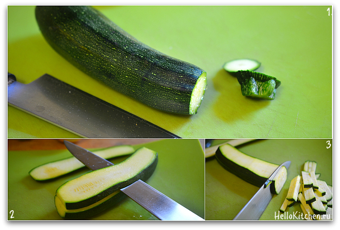 Нарезаем цуккини на тонкие полоски.