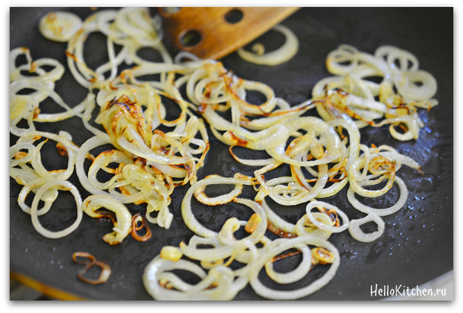 3. В сковороде (желательно с железными ручками, для духовки) разогреваем 2 чайные ложки оливкового масла на среднем огне, обжариваем лук, нарезанный тонкими кольцами, до прозрачности или до румяной золотистости, мне нравится, когда лук золотистый; тогда он даёт очень аппетитный аромат блюду.