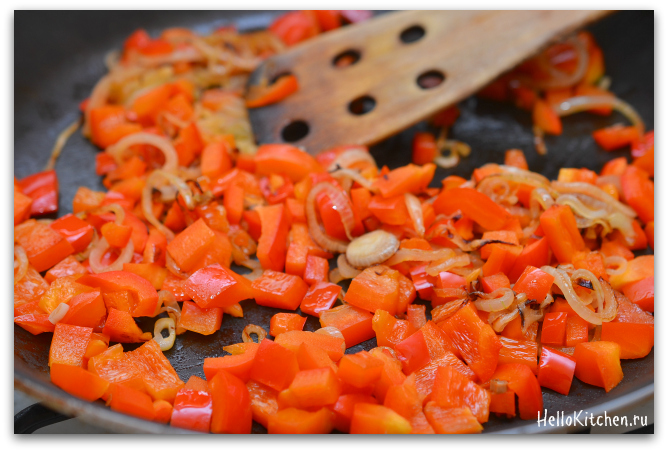 4. Добавляем к луку сладкий перец и продолжаем обжаривать на среднем огне ещё 5 минут.