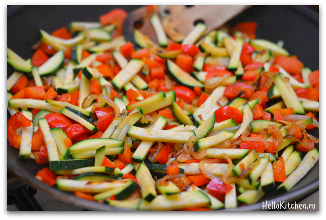 5. Добавляем в сковороду цуккини и жарим ещё 3 минуты.