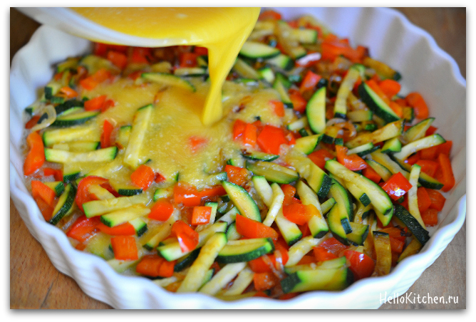 7. Заливаем овощи яично-сырной заливкой и отправляем в разогретую духовку на 10-15 минут, или пока фриттата полностью приготовится. У меня была сковорода с резиновой ручкой, поэтому я просто переложила овощи в смазанную растительным маслом форму.