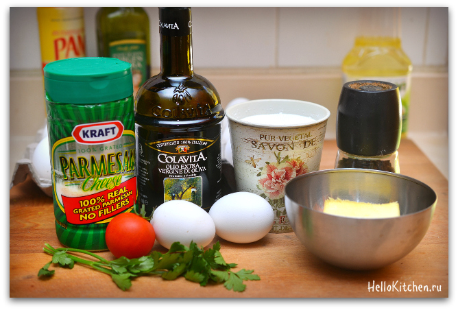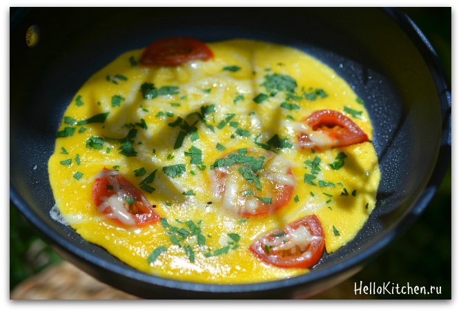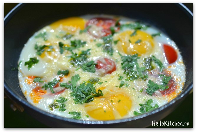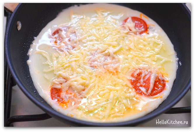 4. Заливаем помидоры белками, солим и перчим по вкусу. Натираем моцареллу сверху белков, посыпаем Пармезаном. Накрываем крышкой, убавляем огонь до минимума, жарим до тех пор, пока белок не станет полностью белый, но не передержите, нам надо, чтобы белок остался нежный, не тугой.