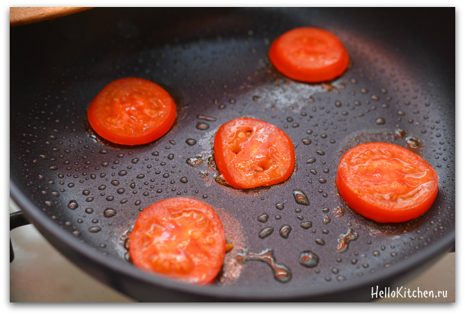 3. Нагреваем сковороду на огне, немного ниже среднего; сбрызгиваем или смазываем оливковым маслом, обжариваем помидоры в течении 1 минуты.