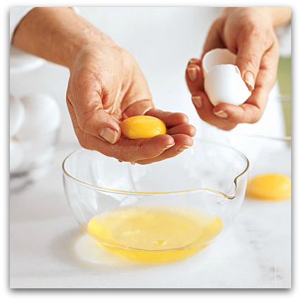 2. Самый удобный и проверенный способ отделить желтки от белков аккуратно и быстро, сделать это руками: разбиваем яйцо пополам, из одной половинки выливаем белок в чашку, а из той где желток, выливаем на ладошку, так чтобы белок пролился сквозь пальцы в чашу, а желток осталься целый и невредимый на пальцах. Картинка из интернета, на которой отлично видна эта технология. Ну а я так стала делать, после того, как увидела это в книге Le Cordon Bleu. Быстро и удобно!
