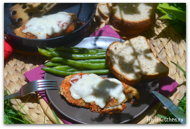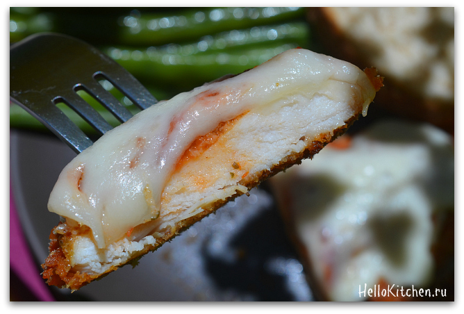 Нежное куриное филе, запечёное в хрустящих сухарях со специями под итальянским томатным соусом и сыром Моцарелла. Вкусно звучит, правда? А на деле ещё вкуснее!