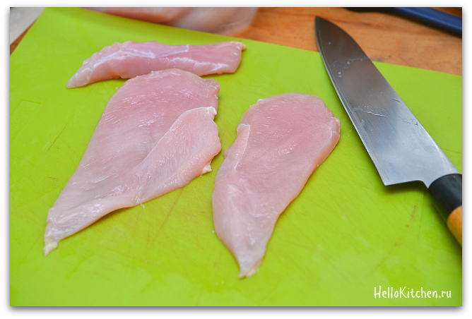 2. Аккуратно разрезаем каждую половинку грудки горизонтально пополам. Отделяем малое филе.