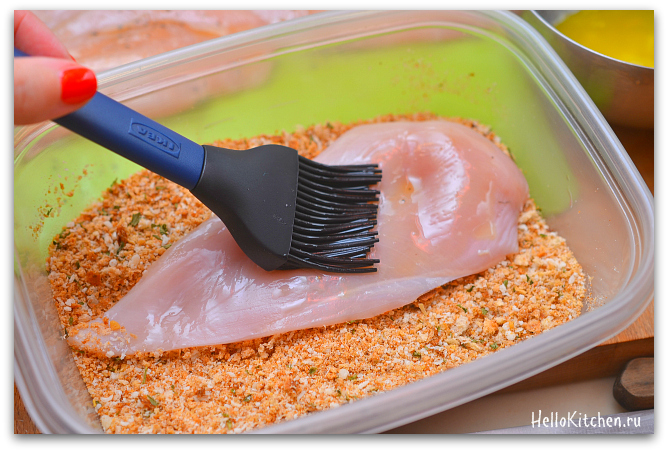 6. Хорошо обваливаем филе с двух сторон в панировочных сухарях и выкладываем на слегка смазанный растительным маслом противень и отправляем в разогретую до 180 градусов духовку на 15 минут.